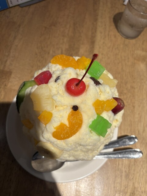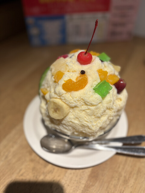 味はミルクでとても美味しいです。フルーツがたくさん乗っていて上から見ると白熊の顔になっています。