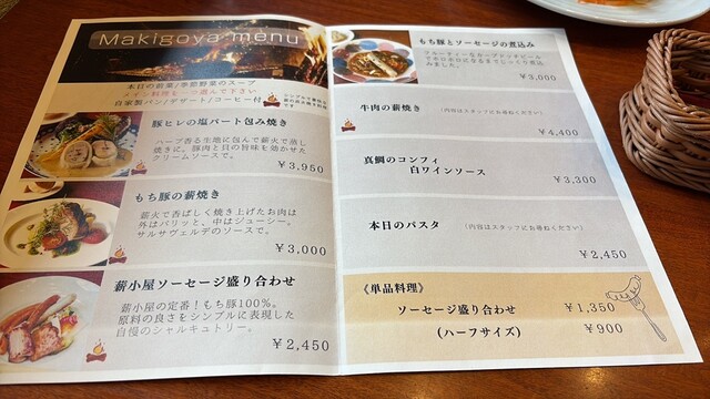 ワインを買いにカーブドッチに行ったのでせっかくですので薪小屋でランチです。丁度満席になったばかりとのことでブザーを預かり一旦お店を離れます。ブザーがなりませんがお店にもどり、丁度案内されました。薪小屋ソーセージ盛り合わせともち豚の薪焼き、ワインはサブル赤をオーダーしました。