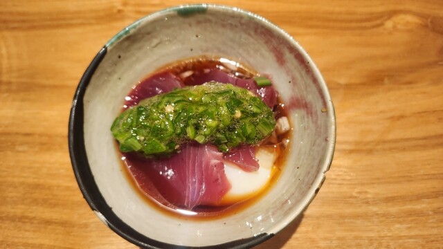 1皿目のウニ・オン・ザ・煮卵のこぼれいくらを2皿目に重ねてみたり、出汁に浸した刺身を食べ終えたあと、残った出汁でさつま揚げを楽しんだり。