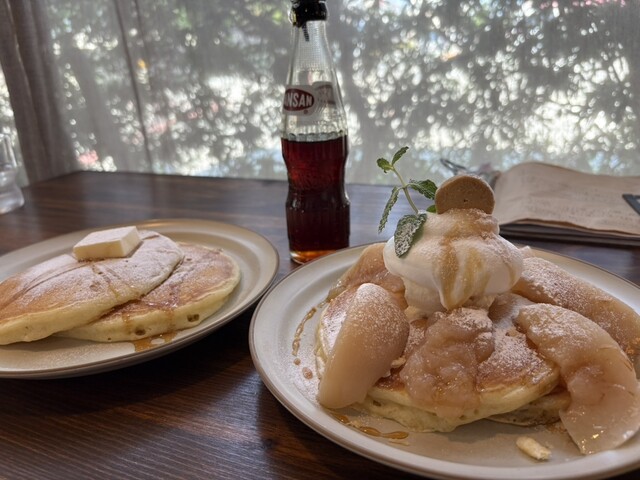電話予約して伺いました。季節限定の桃のパンケーキとプレーンのパンケーキを各2枚、フライドポテトとサラダ・コーヒーをオーダー。繊細だけどふわふわ過ぎず、さっぱりしたパンケーキ生地は何度食べても美味しい!食べごろの桃と桃ジャムにアイスクリームとホイップクリーム。プレーンはバターとメープルでシンプルな美味しさを堪能。フライドポテトのカリカリ加減塩加減◎、サラダにかかっていたゴマドレも◎、コーヒーは地元老舗のもので風味抜群これも◎オーダーはレジで前払い、お水もセルフだけどワンオペに合うオペレーション◎インテリアはお洒落でトイレも隅々まで気配りが施されており、快適な時間を過ごせるカフェです♪また絶対行きます。