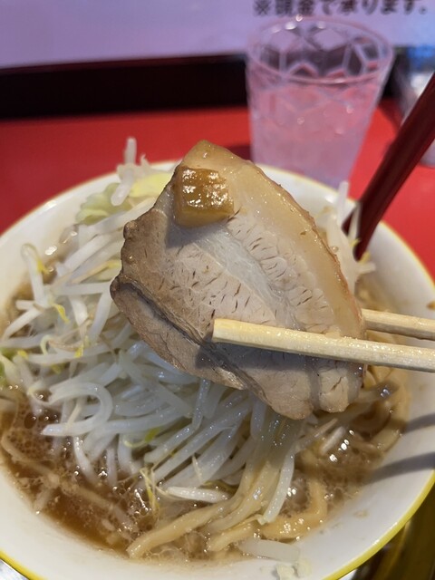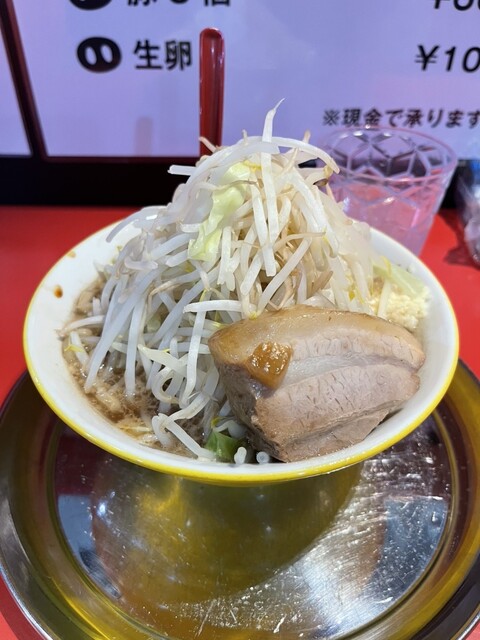 初めてお伺いしました。主に連れられてラーメン食べにちょっと遠出。店内はカウンターのみ。出かける前におにぎりを食べてしまったので、野菜ましましにしたかったけど、主からやめとけと言われて、野菜ましで我慢。にんにくもましましにしたかったけど我慢。カラカラにんにくも我慢。背脂苦手なので背脂抜きでいただきました。麺カタのわしわし~。わしわし麺が次郎系に近いそうです。野菜ましましでもいけたなー。次こそは自分の好みのトッピングで食べたい。