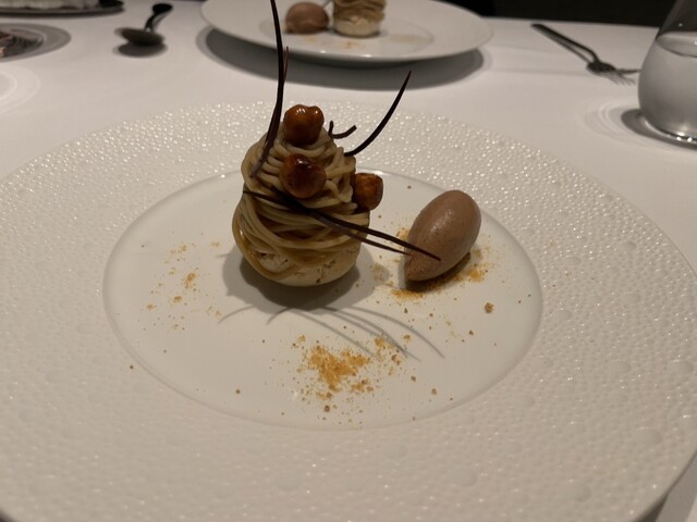 デザートのモンブランは秋を感じさせる季節感であり、見た目以上にザクザクとした食感も楽しめた!