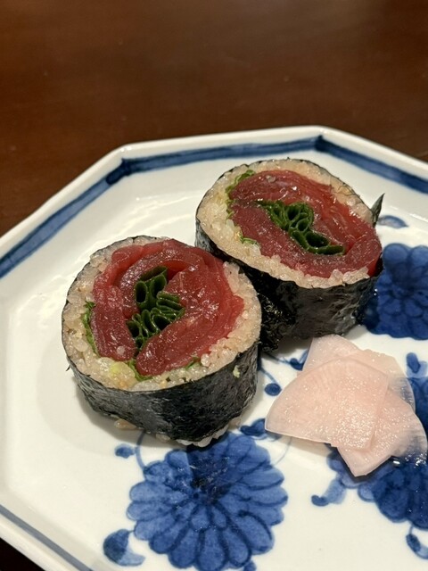 『まぐろの鉄火太巻き』は、シャリとネギの食感がほどよくマグロの豊かな旨みを引き立てます。シソの風味がアクセントを加え、清涼感を与えて後味をさっぱりとさせています。ボリュームがありながらも、全体のバランスが取れていて、満足感のある逸品でした