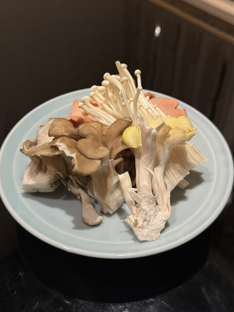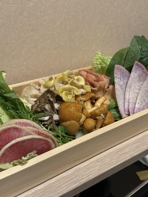 『野菜・きのこ盛合せ』には、大粒なめこ、タモギダケ、トキイロヒラタケ、ハナビラタケ、紅心大根、紫大根など。中でもはなびらたけのコリコリした食感が印象的。