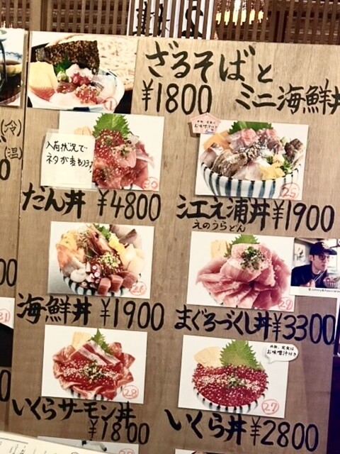 以前別の海鮮料理屋で丼が凄ーく小さかったので、この日は天ざるとミニ海鮮丼(全部もり)¥2800を頼んだ。 食べ切るのがやっとな位ボリュームがあった。 男性でも満足な量だったらしい。