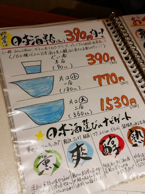 日本酒は自分が好きなのを頼むも良し、店員さんに聞くのも良し。日本酒の知識が豊富な店員さんしかいないので、迷った時はお任せして良いと思います。個人的に良かったのは流輝(るか)。甘めで飲みやすいので一杯目や女性の方にオススメです。