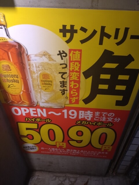 ハッピーアワーで角ハイがノーマル50円、メガ90円と破格です。何かと値上げの時代ですが、ココは是非このままでいて欲しい(._.)