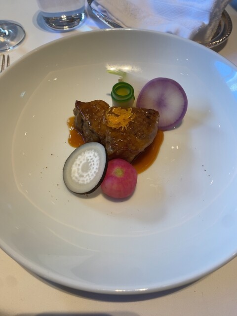 コースで初の魚料理でした。香りの良い鰆でアボカドなどを挟んだ一皿です。ソースの味が生魚である鰆と相性がよく美味しかったです。アボカドなどの量も丁度良かったので、鰆がしっかりと活かされていた一皿だと感じました。