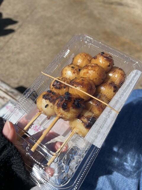 醤油団子です!私醤油団子大好き人間で、子どもの頃はおじいちゃんと醤油団子を買いに行くのが1番の楽しみであり、思い出深い食べ物です!都内に醤油団子というものがほぼないんですけど、いくつか行った中でダントツ美味しい、私が大好きな醤油団子でした!醤油の味も濃くて完璧でした!みたらしはないかもしれないです!ですが、この通りのどこかにあると思うので!都内で1番美味しい醤油団子です!醤油団子都内にないので、好きなら絶対行ってください!ありがとうございました!
