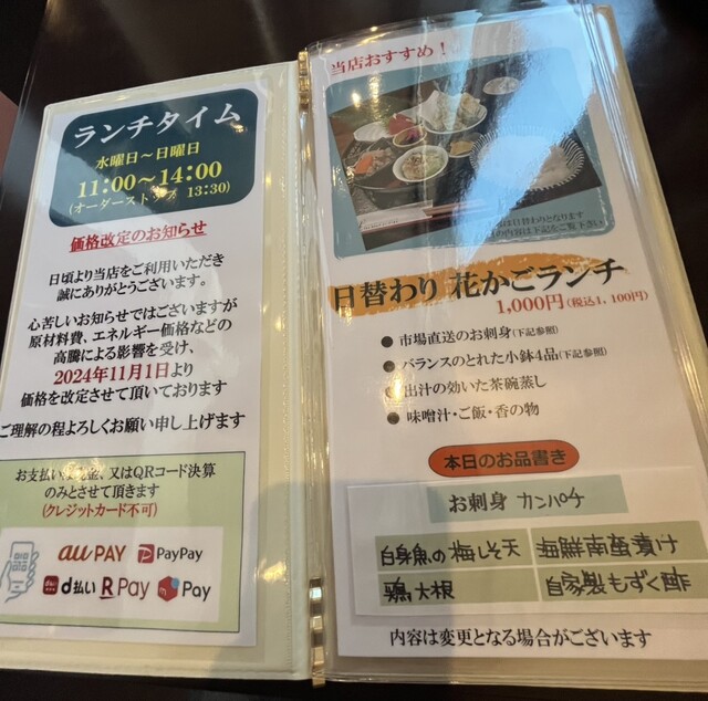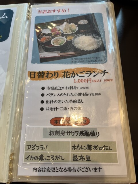 花かごランチ 1100円税込 ご飯大盛50円税込