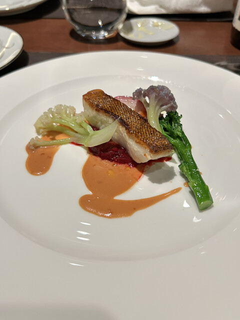 岩手アイナメ ビーツ(アイナメの皮目を炙り身は余熱で ビーツ千切りを添えて ビーツのソースで もものすけというカブとブロッコリーニと2種の カリフローネ)