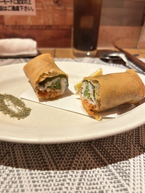 パリパリの春巻きの皮に包まれたしっとりした真鯛とサクサクとした食感の良いレンコン
