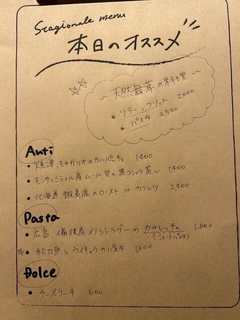 本日のオススメメニューが行くたびに更新されており、その時々の旬な食材を楽しむことができます。