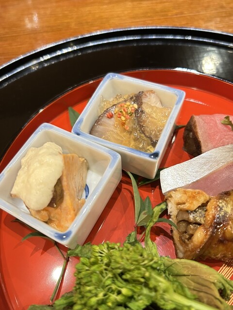 八寸 ・あん肝、上にとろろ、中に奈良漬 ・ナマコの酢漬け ・ローストビーフ ・シメサバに黄身酢 ・数の子の麹漬け ・穴子のゴボウ巻き ・菜の花は炙って
