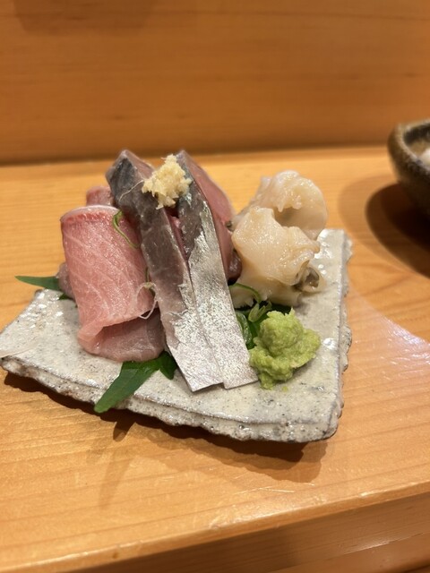▪️刺身盛り合わせ 千葉の勝浦カツオ 藁焼き 銚子の金目鯛 北海道の青柳 伊勢の北海縞エビ 釧路の真つぶ貝