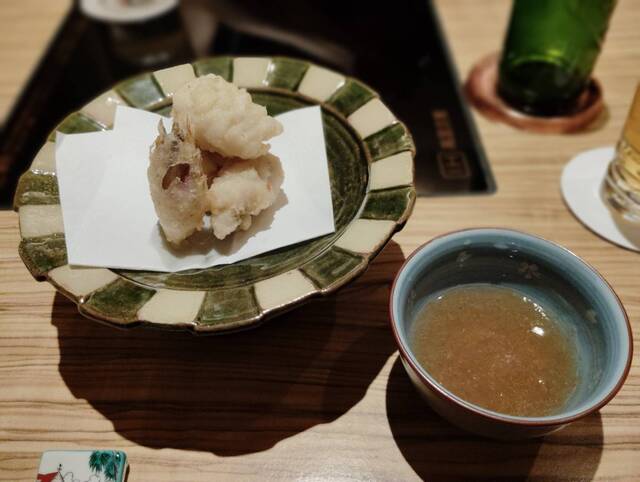 鮑の頂き方の人生No.1がまたうお吟さんにより更新されました♡唐揚げにしたらおいしい食材No.1でもありました笑〃しっかりあがって衣は香ばしいのに鮑はものすごく柔らかいまま♡きもの深いコクと一緒に頂く贅沢極まりない至福の味でした〃
