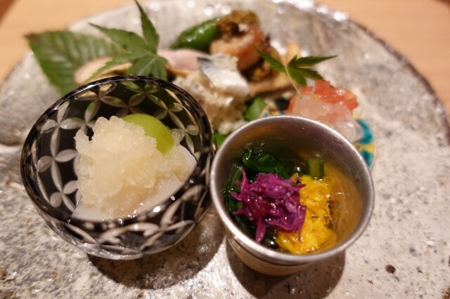 (マスカットと帆立みぞれ和え、落花生、〆鯖と菊花、子持ち鮎、鮑唐揚げ肝味噌、伏見唐辛子)