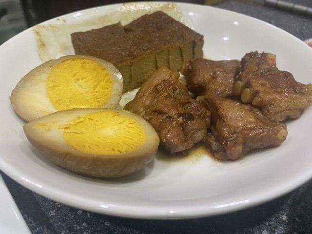 豚バラ軟骨の醤油煮…甘辛醤油味で八角がよく効いてます。軟骨の歯触り、味がしっかり染みた厚揚げ、卵が最高。