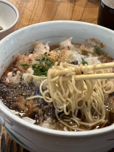 土曜日遅めのランチ…数えきれない位前を通ってたのにこんな所にこんな良い店あるの知らなかった!店に一歩入れば渋谷のど真ん中と思えない落ち着ける空間。10分弱まって着席。お目当ての冷やしなすそば。煮浸しの茄子の上に大根おろしと鰹節が山盛り。ネギと生姜おろしもついて来る。そばはかなり細麺でほんとに夏にぴったりですっきりと食べられる。ビール中瓶に加えて地酒90ミリ600円も頂いてしまいました。ご馳走様でした。