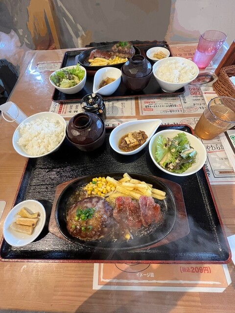 ◉今回初めて吉川市にあるビッグシェフ亭に11時30分頃に伺いました。お店は順番まちのお客さんでいっぱいでテーブルを選んだ為、30分待ちました。店内に入り4人掛けテーブル案内されました。そして注文の料理はお店の方のオススメの秋田県産和牛ロース(170g)&ハンバーグコンボの白米/味噌汁/サラダ/小鉢/お新香付き定食を注文しました。運ばれて来た定食には熱々の油飛び散る鉄板の上には和牛ロース・ハンバーグ・ポテトフライ・コーン・玉葱が乗り、ハンバーグにナイフを入れると肉汁が滝の様に溢れ出しジューシーなハンバーグで和牛ロースは柔らかいお肉でした。スパイシーソース(辛口ニンニクソース)を選んだ為、辛い物があまり得意でない私には、少し辛すぎました。辛いのが好きな人には、見た目から辛そうな壺が運ばれて来るので、それをかけて食べることも出来ます。この値段でこんなに美味しいランチが出来て満足でした。とても美味しかったです。ご馳走様でした。