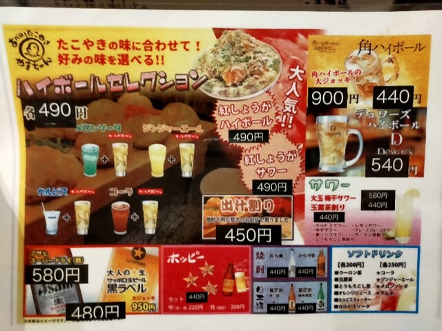奥のカウンターに座り、ドリンクとこぼれネギたこ焼き、キムチのCセット1100円をオーダー。