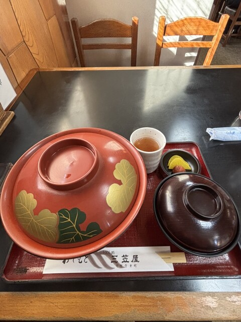 注文は当然三笠丼、しばらく待ちいざ着丼、変わらずスゲーボリューム!!平日昼間からガッツリいただきました( `−ㅿ−´)大きくて平らなエビ天口にすると「ああ、ここで食べてるなぁ」と感じますね
