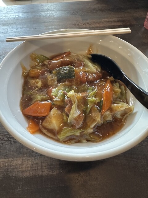冷たい麺に熱い餡をかけて、甘辛い味付けで大変美味。