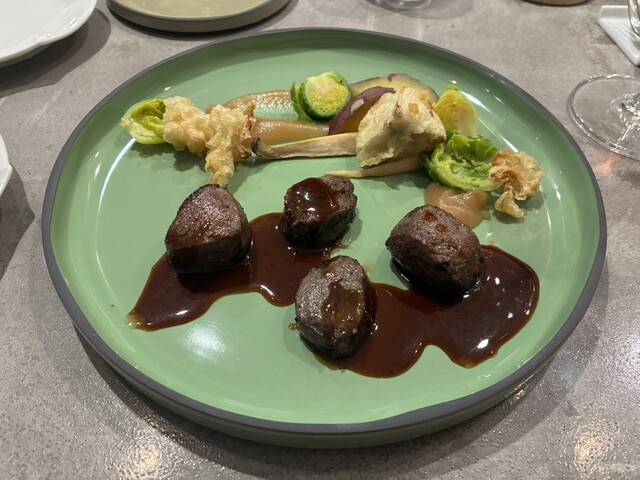鹿肉のローストはブーダンという血のソースと一緒に食べると本当に濃厚でびっくり!!かといってしつこくはなく、りんごのソースとの相性もばっちり!りんごのソースは甘酸っぱくて鹿肉と合わせるととても爽やか〜!