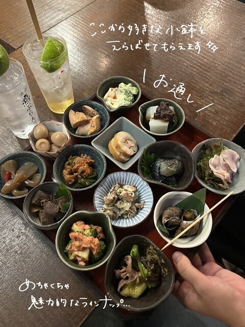 まずはじめに、店員さんが10種類以上のお通しが載ったプレートを見せてくれるので、その場で好きなものを選びます