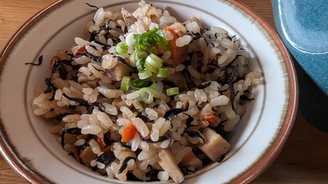 じゅーしーはの具はひじき、豚肉、人参。ひじきの香りと豚のだしが美味い。