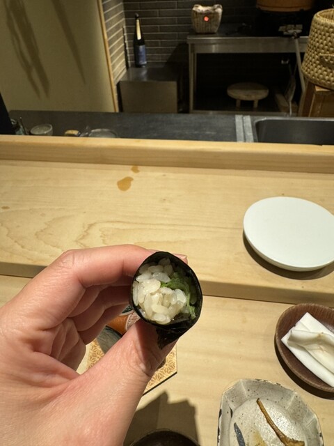 3層になった手毬寿司。噛んでると食感と味の層が分かるんです。毛ガニも良いけどこの時期はこれです。スペシャリテでしたね。