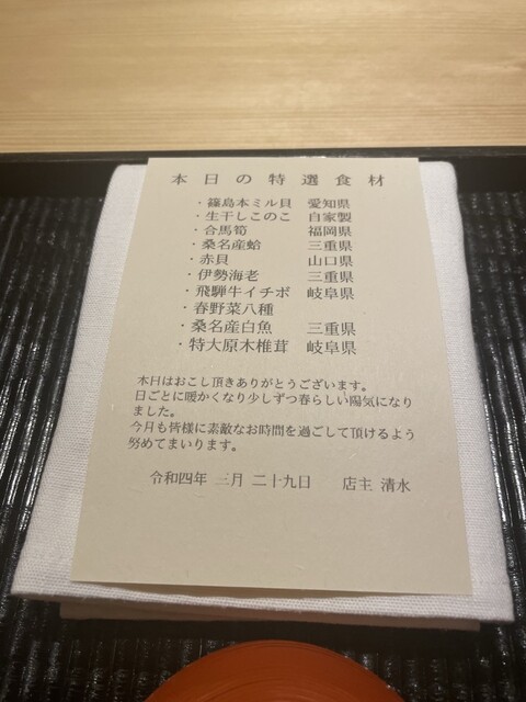 よもぎ茶から始まり、伊勢海老 鯛ちまき、唐墨の飯蒸し、うすい豆の葛豆腐にミル貝…