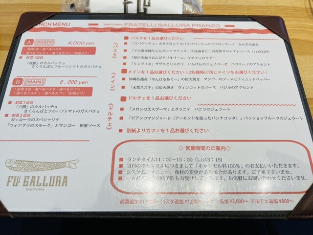 前菜2皿、選べるパスタ、選べるメイン、選べるドルチェ、選べるカフェとなっています。
