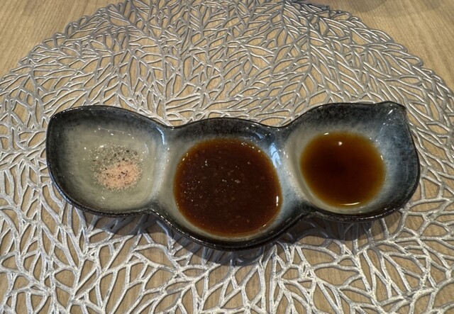 ピンク塩、オニオンソース、梅ポン酢(自家製)。
