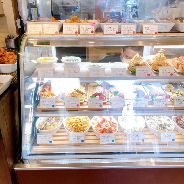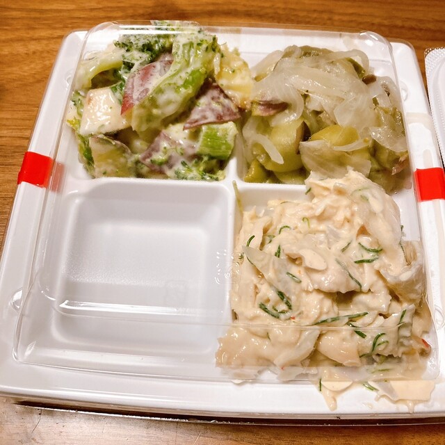 平日の15時頃。すでに少なくなっているデリもいくつか。最初は頼み方が分からず、お店の方に聞いたところ、赤シールが貼ってあるデリがメイン。青シールがサイドで、お弁当は、赤シールから1品、青シールから2品選んでくださいと教えていただきました。