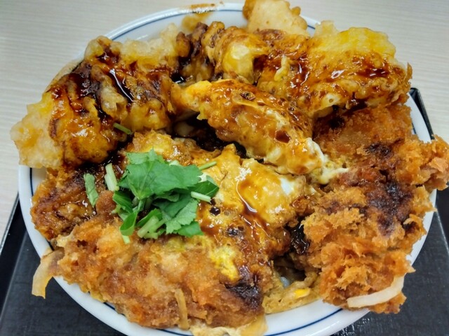 豚ロース天とチキンカツ2枚を玉子でとじた豪華な丼で、コク深い「黒味噌ダレ」が特徴の期間限定メニューです。食べ応えのあるお肉と甘辛いタレ、卵が絡み合いご飯が進み大変美味しかったです。ご馳走様でした!