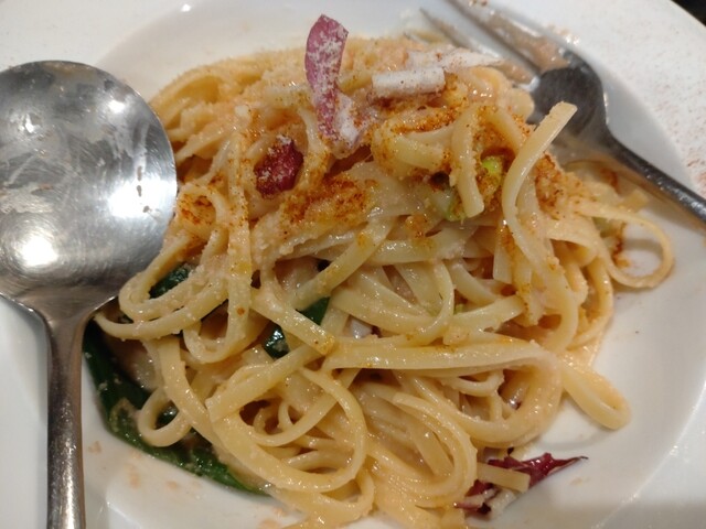 パスタは明太子ベースのパスタをオーダー。辛めですが、手打ちパスタで良かったです。