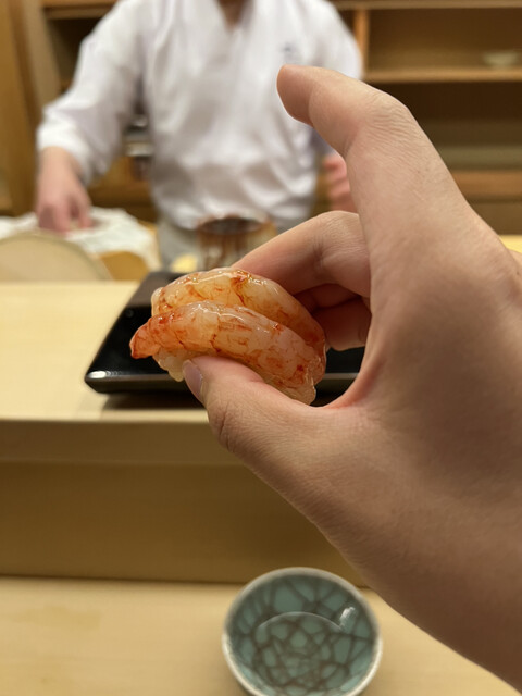 その後に続く紫ウニの手巻きと甘海老の握りも抜群の鮮度。特に紫ウニは、ほんのり果実のような甘い香りが立ち上がり、旨味がゆっくりと寿司飯と一体になって広がっていく。じわじわと口の中で膨らむこの“遅れてくる旨味”の感じが本当にクセになる。