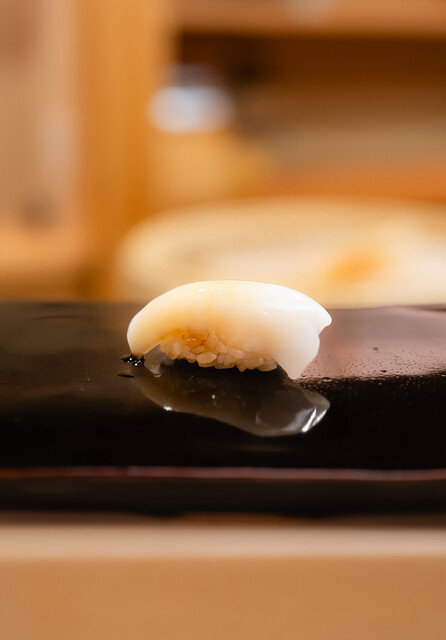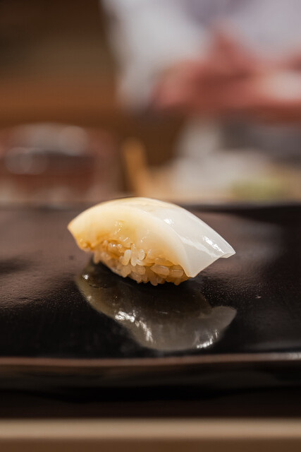 名店の中でも、ここまで凛と立ち上がる車海老と烏賊の握りはなかなか出会えない。その佇まいは、大将の端正で堂々とした姿そのもののようだ。