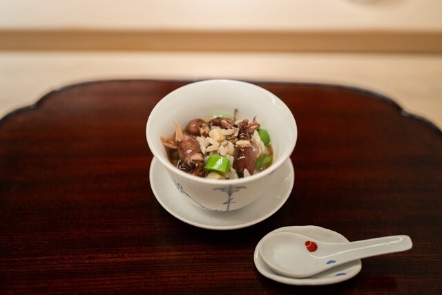 蛍烏賊と筍の炊き込みご飯にはピーマンが加わっており、その組み合わせはまるで中華の「青椒小炒肉」のような懐かしさすら感じる味わい。もしかすると、シェフが上海旅行で得たインスピレーションかも?