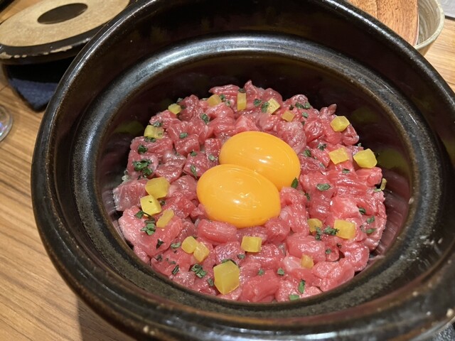 土鍋一杯の炊き込てご飯の上にレアなお肉が乗っていて、店員さんがその場で混ぜ合わせてくれました。