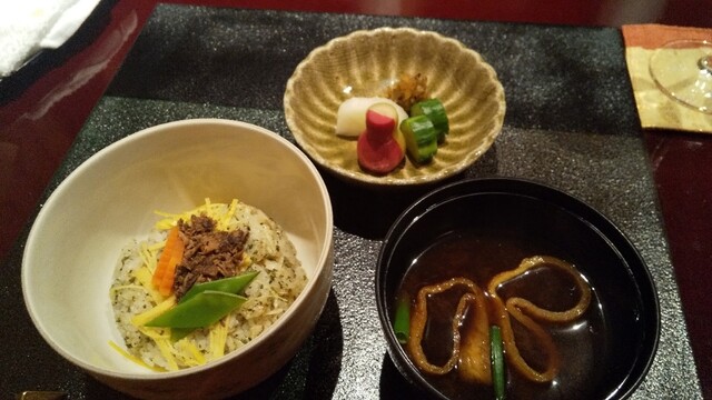 前菜の琥珀寄せ、富士鱒餡掛けと丸茄子に豆乳餡がかかって黒七味がきいた煮物、子持ち鮎もしみじみと美味しく。