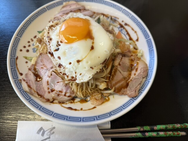柔らかいチャーシュー3枚に綺麗に焼かれてる目玉焼きが鎮座