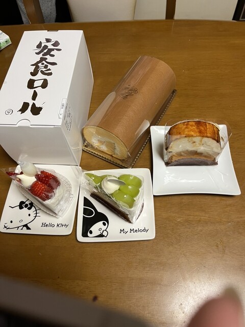 神奈川県で評価が高いお店スイーツガーデンユウジアジキさんに来ました。洋梨のシブスト、苺とレアチーズのタルト、シャインマスカットとレアチーズのタルト、安食「アジキ」ロールを買いました。約6000円はちょっとたかいですねしかし、どのケーキも凄く美味しいです苺のレアチーズタルトは練乳が付いてます。