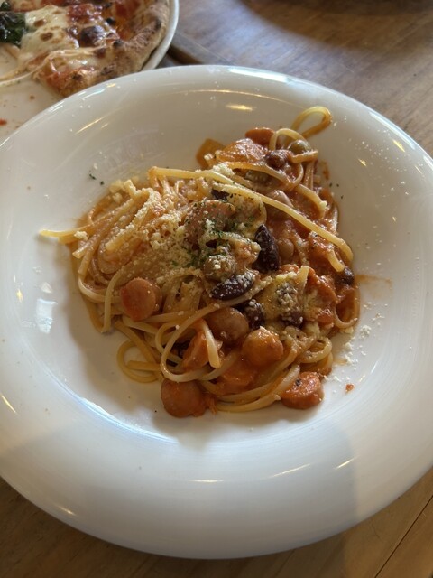 お盆休み中でも営業していたので予約して3人でランチに行きました。ピザは大きめサイズでパスタは2皿。