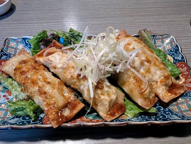 棒状の餃子と白髪ネギが美しく盛り付けられています。