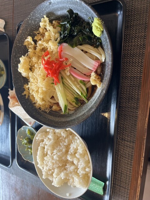 私のおすすめはランチメニューのB、冷やしたぬきうどんと味付きご飯です