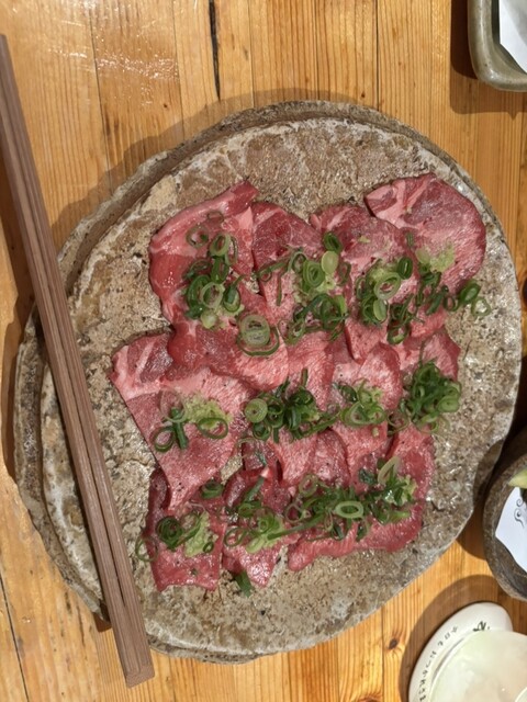 お造り三種盛り、胸肉と長芋の梅しそ磯辺揚げ、霜降り牛タン、特にピスタチオの山葵天ぷらは山葵焼酎のアテに合います。