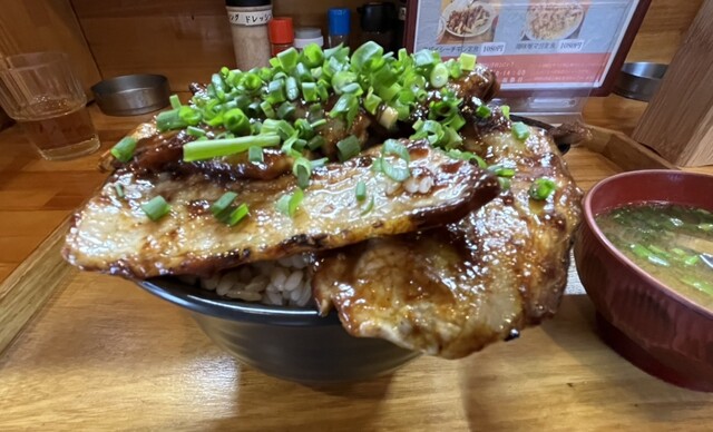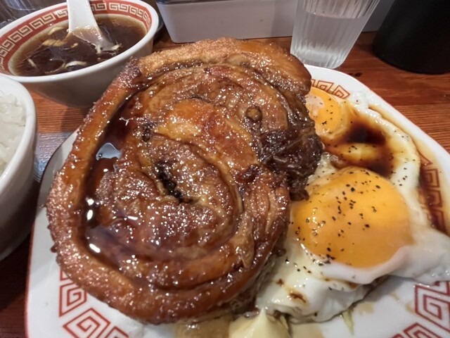 焼肉定食を注文。噂通り、大きいロース肉が8枚、小鉢に素麺、ご飯は昔話に出てくるような盛り、これで普通盛りです キャベツ、付け合わせのパスタもついてかなりのボリュームです...