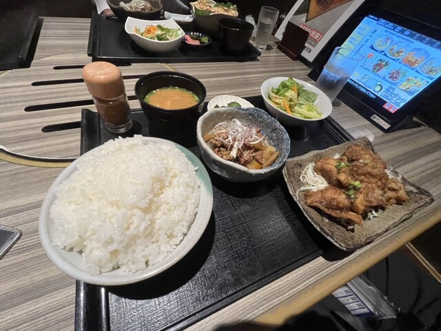 ボリュームも満点。唐揚げ5個にモツ煮に、味噌汁がまた、美味い。また来ます。